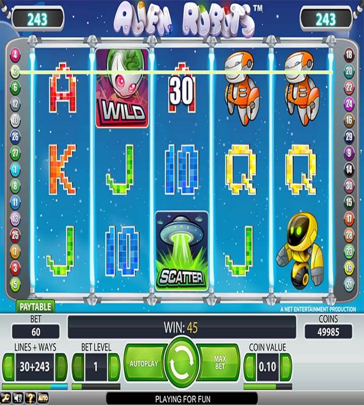 Dessutom har spelautomaten Alien Robots 243 insatsvägar som ökar dina chanser ytterligare.