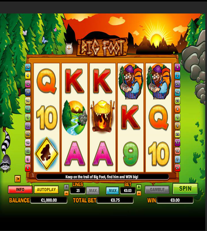 Du har som vanligt en slot-maskin med fem hjul och tre rader så du kan känna dig som hemma. Genom att spela spelautomaten Big Foot är du en campare som försöker få kontakt med omvärlden, och har Big Foot i närheten men du ser kanske mer spåren av honom än själva honom. När du får ett antal av samma symboler så har du möjlighet att casha in. Med hjälp av scatter- och wild-symboler kan dina insatser och vinster bli desto större. Du behöver ha de båda symbolerna på dina sida och se till att fånga in bonusarna för att på så sätt öka chanserna till stora vinster.