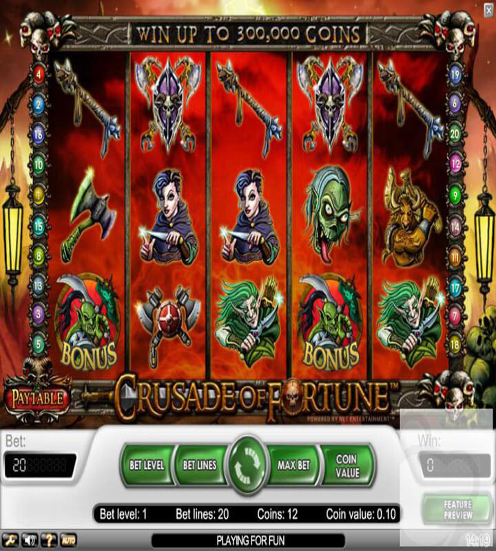 rusade of Fortune slot är en spelautomat som är enkel att spela. Funktionerna är i princip de samma som för övriga spel i genren. Är du nybörjare rekommenderas du att provspela så du får lite koll på hur det fungerar. Du kommer snabbt förstå grundprinciperna i spelet. Crusade of Fortune har, som de flesta spelautomater, en del individuella inställningar du kan göra innan du sätter igång. Det handlar om insatsnivåer, myntvärde etc.