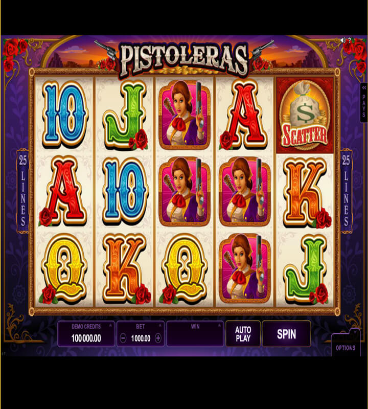 Spela spelautomaten Pistoleras och du har fem hjul med tre rader framför dig. Det är det vanliga upplägget på den här sortens spel. Du har tjugofem insatslinjer som du kan casha in på. Du kan, om du har tur, vinna på Pistoleras och då betyder det över 100 000 kronor. Som vanligt finns scatter-symbolen och om du får minst tre sådana spridda över hela fältet så få du vinster till dig. I Pistoleras får du västern-musik, roliga karaktärer och bra vinstutdelningar vilket bör vara anledningar nog till att du återvänder för att spela Pistoleras gång på gång.