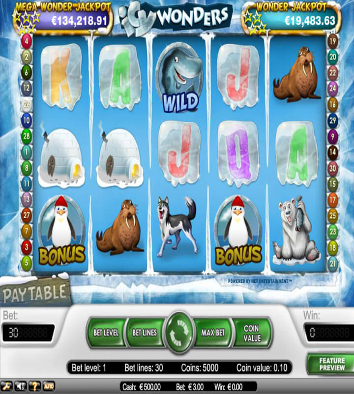 Icy Wonders slot, tar med dig till ett islandskap med pingviner, valrossar, isbjörnar, huskeys och igloo’s. Underverken eller miraklen i detta spel är de två progressiva jackpottarna Mega Wonder Jackpot och Wonder Jackpot som kan ge dig ett skönt tillskott i spelkassan.