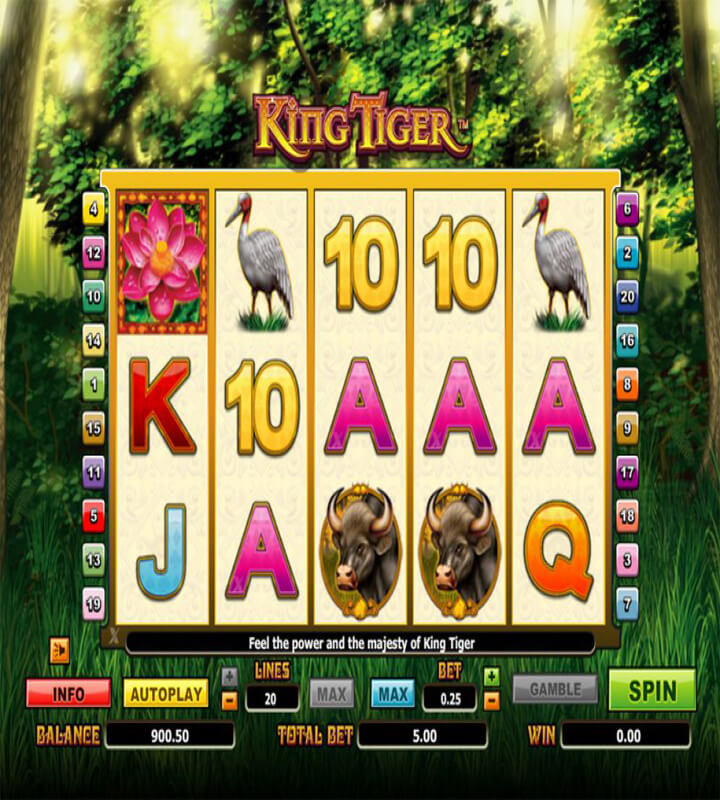 I King Tiger har du de symboler som du ser i många andra spel inom den här kategorin, nämligen siffror och bokstäver. Vilka är värdena av korten i en kortlek där alltså bokstaven K står för det klädda kortet, Kungen. Efter det har du ett gäng med djur att hålla koll på som till exempel elefant och vattenbuffel. Det du ska hålla speciellt utkik efter är tiger-symbolen och lotus-symbolen eftersom det är de som kan ge dig bäst och flest fördelar. Tigern är spelets wild-symbol och den som är din hjälp till att fler av samma symbol vilket du vill ha. Lotusblomman är scatter-symbolen och den kan dyka upp på två olika ställen på spelfältet för att det ska hända grejer.