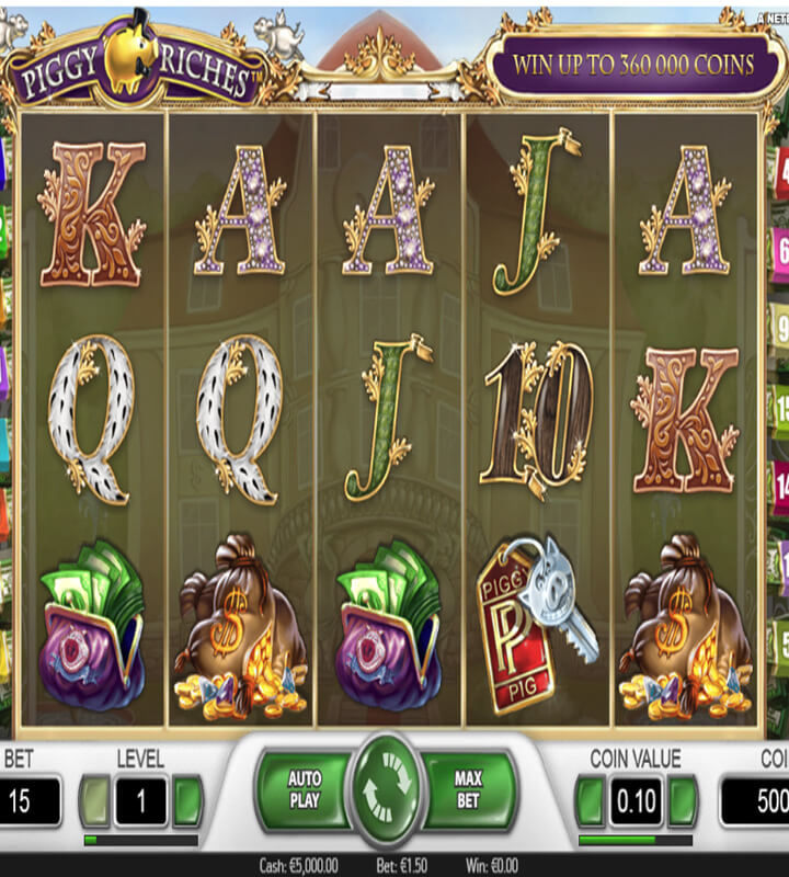 Piggy-Riches-bonusPiggy Riches erbjuder tyvärr ingen progressiv jackpot. Men häng inte läpp för det! Om du höjer din insats påverkar detta vinstsumman och du har chansen att vinna upp till 360 000 mynt. Hitta och töm spargrisen redan nu!
