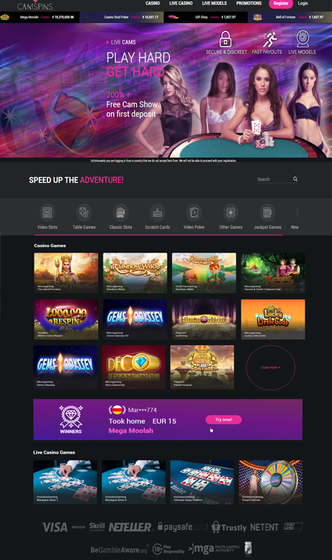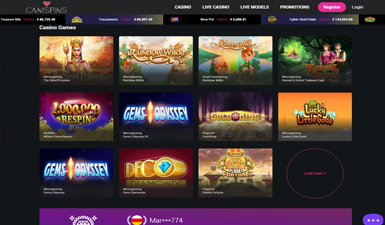 Det finns många anledningar till att spela CamSpins spel, varav en är att det finns över 800 spel olika att välja mellan. Oavsett vad man är sugen på att spela kommer man antagligen att hitta något att roa sig med inne i antingen casinot eller inne i live casinot. Och det är inte bara bland spelen man hittar många olika alternativ, för de har även en stor uppsättning olika livemodeller som man kan chatta med och som även utför heta cam shower. Man kan dessutom lära känna dem innan man börjar spela CamSpins eftersom de har profiler man kan spana in.