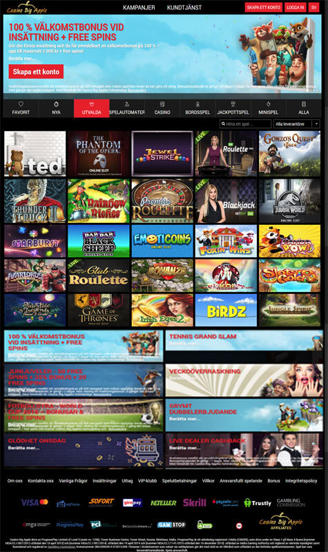 Casino Big Apple casino kanske inte tar dig till New York, men de tar dig till något som är ännu bättre. Du tas nämligen med till förstklassig underhållning utan att behöva lämna din dator, och du får börja utforska underhållningen med hjälp av en bonus på 2000 kronor samt 10 free spins.