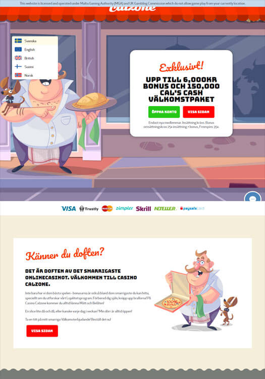 På framsidan av Casino Calzone casino kan man läsa texten ”7 dagar utan pizza gör människan svag”, och det verkar syfta på att man kan fylla på sitt bonusförråd inne hos pizzabagaren Cal för att orka med mer. Och just pizzor är det tema som hela Casino Calzone online casino bygger på med sin röda markis högst upp, bagaren som dyker upp på sidans bilder och spelen som ligger serverade i pizzaformade ikoner!