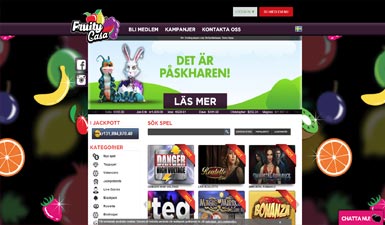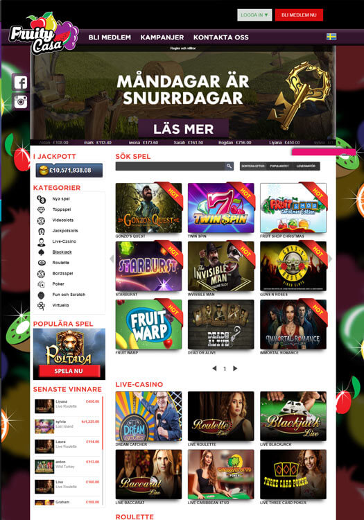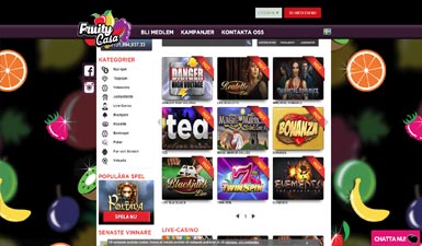 På Fruity Casa nätcasino är det lätt att hitta till de olika avdelningarna, tack vare de fåtaliga menyvalen som behövs för att navigera sig fram. Utseendemässigt är Fruity Casa casino också smakfullt inrett, med ett och annat fruktigt inslag här och där. En detalj, som också blir allt vanliga bland nätcasinon, är att de senaste vinnarna löpande annonseras på casinots framsida. Kommer ditt namn att finnas med där härnäst?