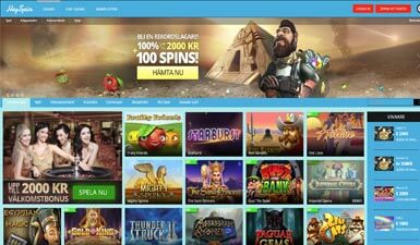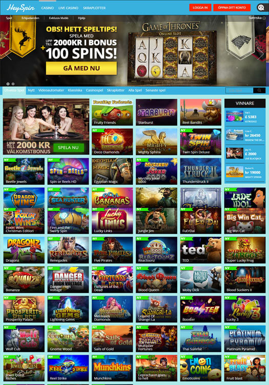 Det första man lägger märke till hos HeySpin casino är deras lekfulla blå färg, och man kan ha väldigt roligt därinne eftersom casinot tar din underhållning på allvar. Man kan sätta snurr på en mängd olika spel inne i såväl casino som live casino, och för att nya spelare ska komma igång på direkten finns det dessutom ett fint välkomstpaket på 2000 kronor och 100 free spins att hämta ut!
