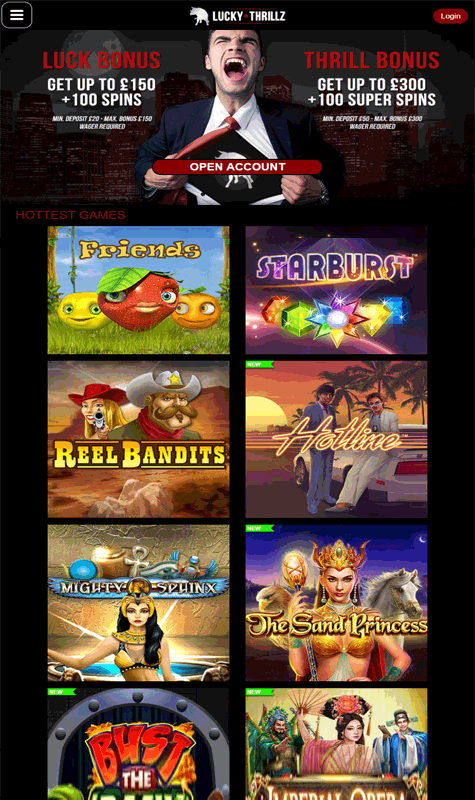 När man bläddrar runt i kategorin som listar alla casinots spel hittar man över 350 titlar. Och några av Lucky Thrillz spel har belysts lite extra för att de är populära för tillfället och bland dem hittar man Fruity Friends, Starburst, Hotline, Mighty Sphinx, Reel Bandits, The Sand Princess, Bust the Bank och Imperial Opera.