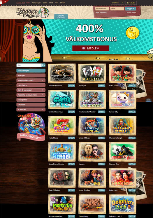 Retro är dock inte de spel som finns i Madame Chance online casino eftersom utbudet är både toppmodernt och välfyllt. Det finns såväl videospelsautomater samt kort- och bordsspel, skraplotter, klassiska spelautomater, microbets och actionspel i menyn i spellobbyn att välja bland. Totalt sett finns det någonstans runt 470 spel i Madame Chance nätcasino man kan roa sig med.