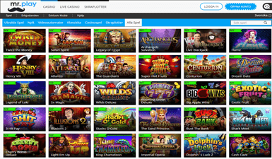 Högst upp kan man se de tre kategorierna casino, live casino och skraplotter och när man klicka på casino kan man se ytterligare indelningar för MrPlay spel: Utvalda spel, nytt, videoautomater, klassiska, casinospel, skraplotter, alla spel och senaste spel.