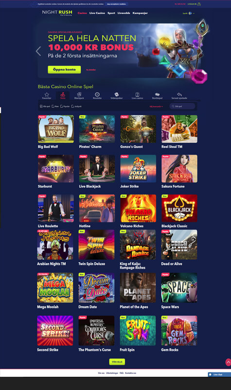 NightRush casino vill att alla nattugglor ska känna sig som hemma, men om du är mer av en morgonmänniska är du givetvis också välkommen in – Casinot är givetvis öppet dygnet runt så att du kan spela alla deras spel. Och för att komma igång på ett bra sätt kan du dessutom hämta ut en välkomstbonus på upp till 10000 kronor för att bekanta dig med casinot på bästa sätt, vilket är genom att spela och ha roligt.