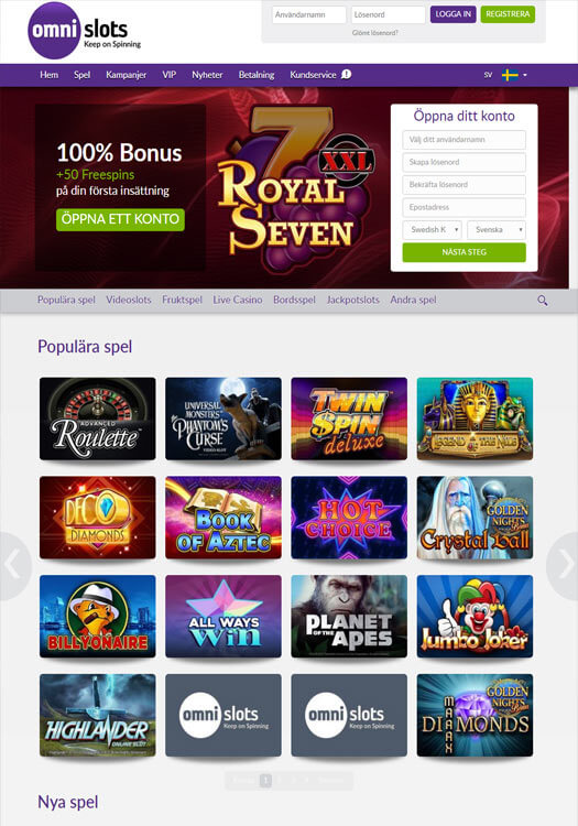 Hos OmniSlots kommer man mycket riktigt att hitta slots av olika slag, precis som det låter på namnet, och för nya spelare ingår det en välkomstbonus med 50 free spins på Starburst så att man får prova på ett av spelen med en gång. Dessutom ingår det 3000 kronor där man får välja spel på egen hand! När man tar sig till OmniSlots möts man av deras slogan ”Keep on spinning”, det vill säga att man ska fortsätta snurra på hjulen i spelen. Och ett bra sätt att göra det på är förslagsvis att använda sig av den OmniSlots bonus man möts av hos casinot – Eftersom det finns upp till 3000 kronor samt 50 free spins i OmniSlots gratis bonus att använda sig av!