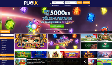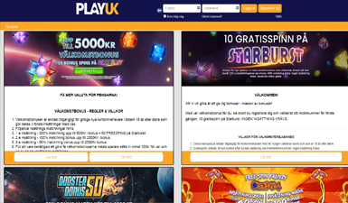 Man kan sätta igång med att spela hos PlayUK på en gång eftersom det ingår en registreringsbonus på 10 free spins där man får testa på Starburst. Därefter fortsätter PlayUK casino bonus med tre insättningsbonusar, och sammantaget kan man få upp till 5000 kronor samt 50 free spins. De 50 snurr som ingår i den första delen av PlayUK bonus är på Starburst, precis som registreringsbonusen. För att hämta ut sina tre bonusar ska man sätta in minst 100 kronor.