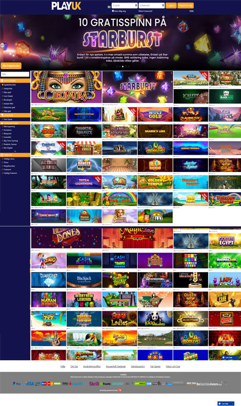 Att spela PlayUK är något för de som vill ta en paus i vardagen och slå sig ned med en uppsättning underhållande spel. Och då är det ett bra val att spela PlayUK eftersom det finns ett casino där man hittar spelautomater och jackpotspel och ett live casino där man hittar livliga bordsspel av olika slag. De har även ett fint lojalitetsprogram där man kan klättra uppåt för att ta del av allt fler förmåner, och en uppsättning på över 600 spel som man kan ha roligt i.