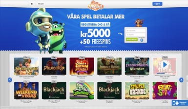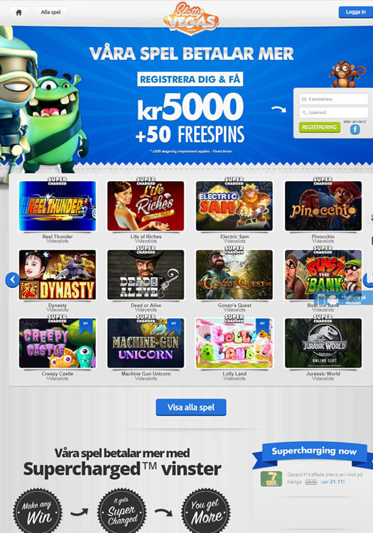 På SlottyVegas får casinospelaren extra mycket pengar tillbaka på sina insatser. Casinots supperladdade spelautomater, eller så kallade Supercharged slots, ger nämligen extra utdelning på alla dina vinster. Denna får nämligen SlottyVegas att betala ut bättre till sina kunder än de flesta andra nätcasinon idag. Slotty Vegas erbjuder alla nya medlemmar en välkomstbonus, som dubblerar din första insättning på casino kontot. Erbjudandet gäller insättningar på ända upp till 5000 kronor. Vilket är förhållandevis ovanligt bland nätcasinon idag. Dessutom följer 50 gratissnurr med denna välkomstbonus som går bra att utnyttja på veckans utsedda casinospel. Om just denna veckas spel inte tilltalar dig går det också alltid bra att utnyttja dina free spins på NetEnts spelautomat Starburst. Som alltid levererar god casinounderhållning.