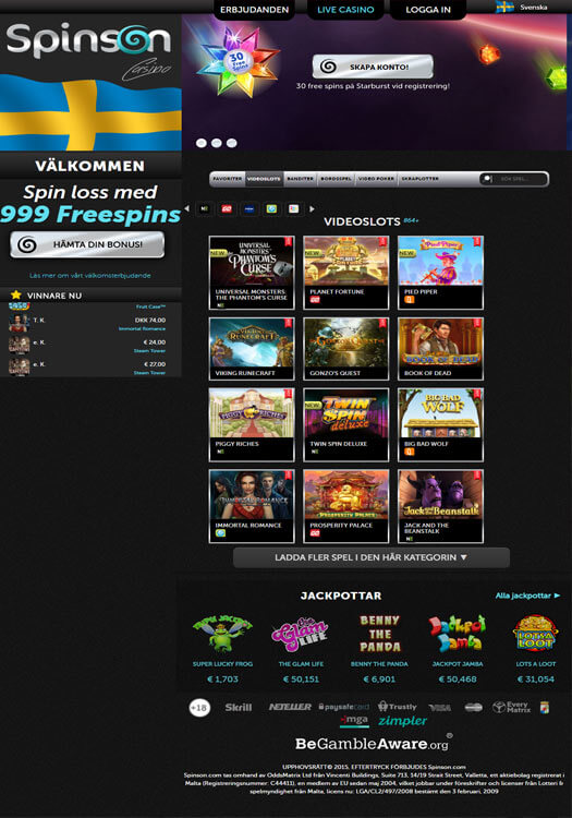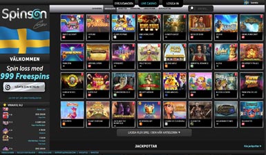 välkomstbonus på Spinson casinoSpinson nätcasino satsar mer på innehåll än utseende. Det låter kanske som ett hårt betyg, men deras relativt tråkiga grå utseende kompenseras för med ett massivt spelgalleri på över 700 spel. Dessa är fördelade mellan skraplotter, bordsspel, videopoker, videoslots och mer klassiska banditer, så du har dessutom god variation. I skrivande stund finns det dessutom hela 39 olika jackpottvinster att vinna, om du känner att du har turen med dig.